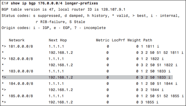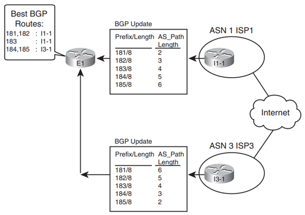 - Hai ISP router quảng bá 5 prefix giống nhau đến E1: 181.0.0.0/8 đến 185.0.0.0/8