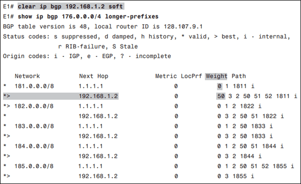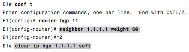 Chúng ta có thể set weight cho tất cả các tuyến học được từ một neighbor bằng lệnh neighbor weight. Tiếp tục với ví dụ trên, trên E1, set weight cho tất cả các tuyến do I1-1 quảng bá bằng 60.