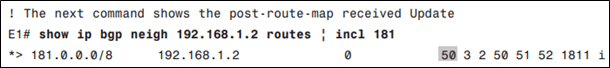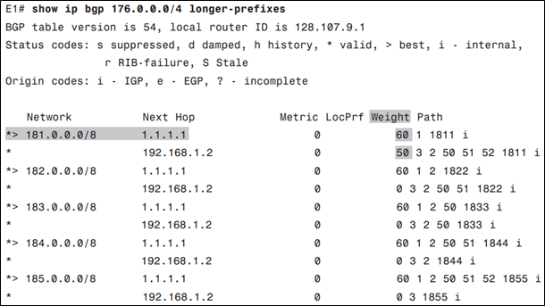 Sau khi thực hiện route-map, E1 sẽ set weight cho tuyến 181.0.0.0/8 bằng 50: