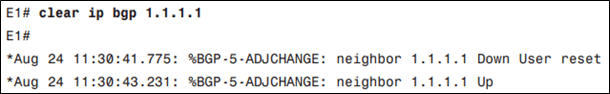 Sau khi thực hiện lệnh clear ip bgp 1.1.1.1 trên E1 thì router E1 và I1-1 sẽ thực hiện lại toàn bộ các bước để thiết lập quan hệ hàng xóm BGP với nhau, router I1-1 cũng sẽ thực hiện lại việc quảng bá tuyến 183.0.0.0/8 –> tuyến đường đến mạng 183.0.0.0/8 đi qua next-hop I1-1 lúc này sẽ mới hơn tuyến đường đến mạng 183.0.0.0/8 đi qua next-hop I3-1 –> tuyến đường đi qua next-hop I3-1 sẽ được lựa chọn làm best route.
