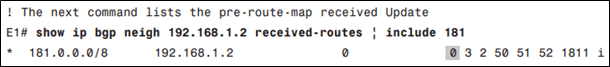 Weight chỉ được set khi E1 nhận được tuyến từ I3-1. Trước khi thực hiện route-map, tuyến 181.0.0.0/8 vẫn có weight bằng 0: