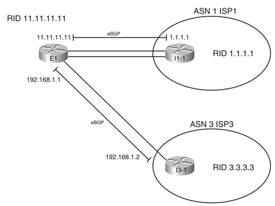 Enterprise có 1 router là E1, router E1 kết nối đến 2 ISP là ISP1 (router I1-1) và ISP3 (router I3-1):