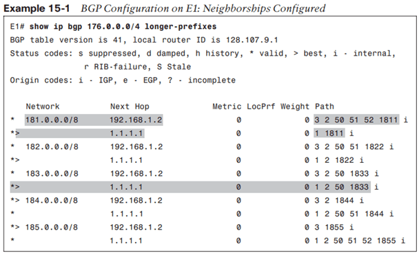 Note: lệnh show ip bgp 176.0.0.0/4 với option longer-prefixes sẽ hiển thị toàn bộ các route BGP mà E1 học được nằm trong có 4 bit đầu là 1011. Dải 176.0.0.0/4 sẽ cover được tất cả các prefix có octet đầu từ 176 đến 191:
